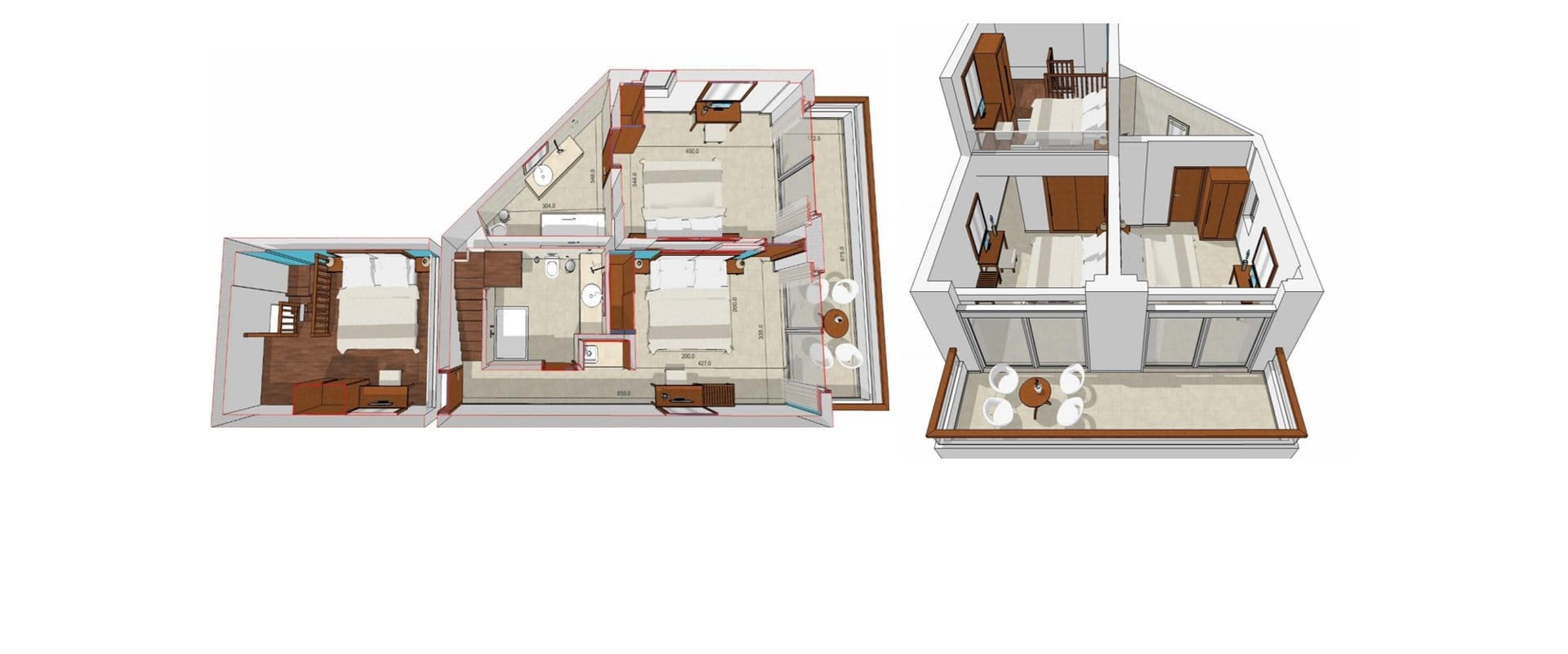 *Σημείωση: Οι φωτογραφίες των δωματίων είναι ενδεικτικές καθώς η θέα και η διάταξη διαφέρουν από δωμάτιο σε δωμάτιο. Τα δωμάτιά μας με θέα στη θάλασσα χωρίζονται σε τρία επίπεδα (1ος όροφος, 2ος όροφος και βεράντα στο ισόγειο.) Η κατανομή του επιπέδου δωματίου εξαρτάται από τη διαθεσιμότητα.